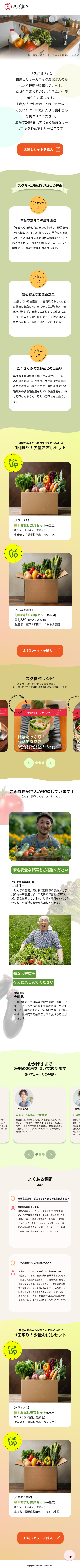 お試し購入へと導くために各箇所にお試し購入ボタンを設置しました。また、ヘッダーの下に自分で編集した動画を入れることで高級感を出せるようにしたり、お試しセットの野菜を使ったレシピ欄を設けることで野菜の魅力が伝わりやすいようにしました。